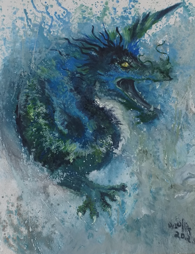 A fierce monster bursts into life in this dynamic painting. I love dragons and wanted to incorporate that with a wild and stormy ocean.