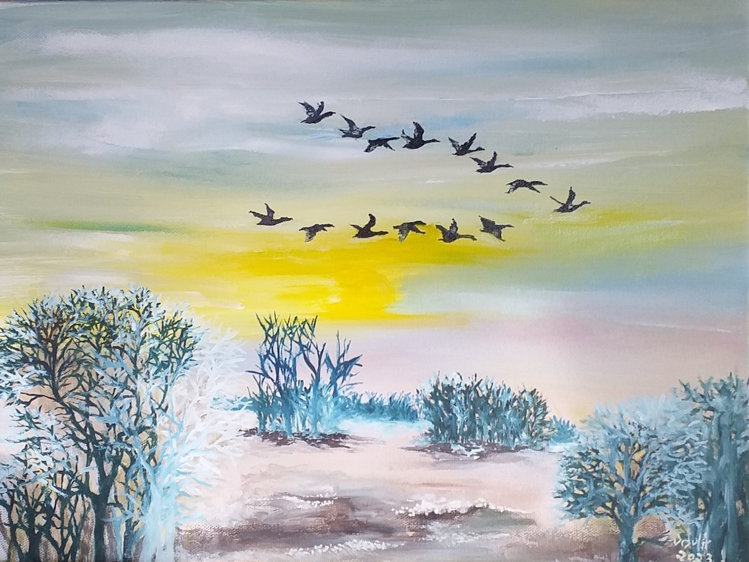 This piece was inspired by observing a sunset at around 15:00 hrs one chilly December afternoon. I had the idea of adding the geese a bit later. I wanted to capture the beauty of an otherwise bleak winter day.